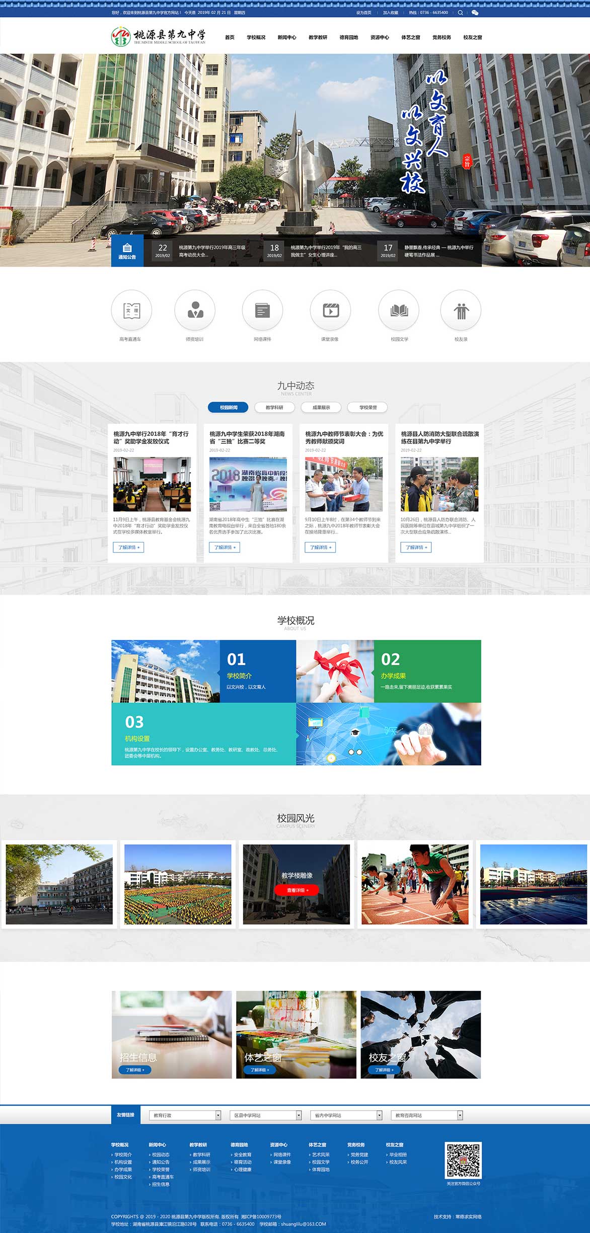 桃源縣第九中學坐落在桃源縣城漳江鎮(zhèn)沅水之濱,創(chuàng)建于1982年,前身為桃源縣城關中學,1999年晉升為市級示范性中學?,F(xiàn)有教學班67個,學生3940人,教職工324人。 學校校園面積70余畝,教學樓、電教樓、學生公寓樓、學生食堂等教學生活設施齊全,儀器室、實驗室、圖書室均達國家二類標準。近年來,投入1000多萬新建了高標準運動場,重修了校門和高三教學樓,辦學條件全面改善,校園環(huán)境更加宜人。