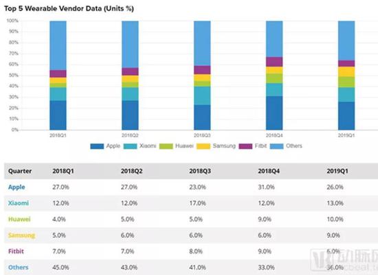 2019年Q1,排名前五的可穿戴廠(chǎng)商依次為蘋(píng)果、小米、華為、三星和Fitbit